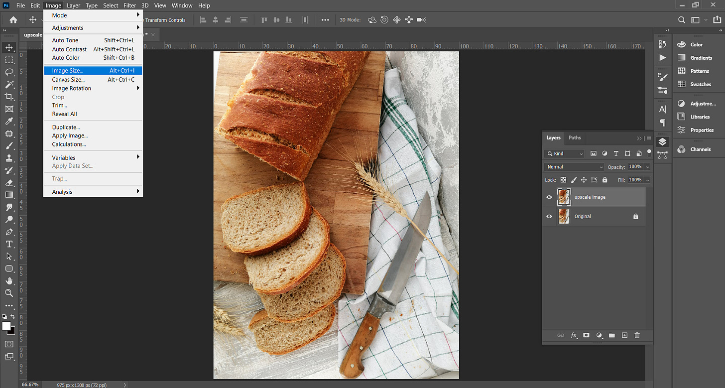 To change the size or resolution of our photo, all we have to do is go to Image and down here to Image size (Ctrl+Alt+I)