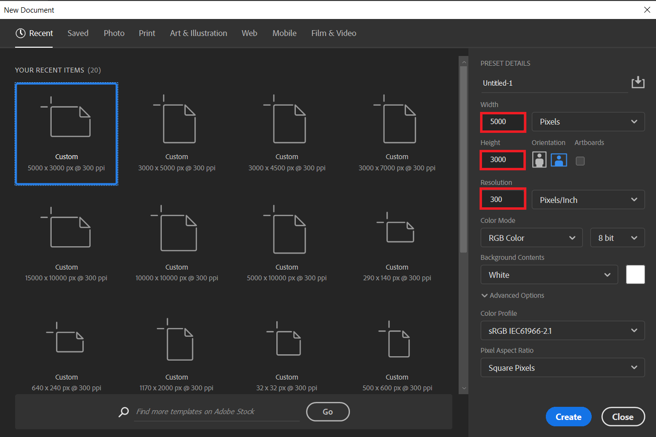 First, I want to create a new document with a higher quality (5000 by 3000-pixel picture at a 300 pixels per centimeter resolution) that is oriented differently from our present photo.