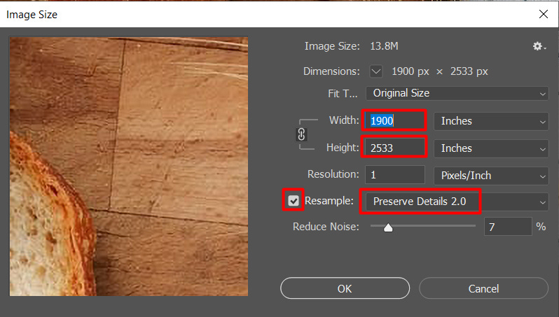 I'm simply going to enter 1900 pixels per inch and then confirm that Include Preserve Details 2.0 is selected, and that resample is set to automatic. Thus, despite its doubling in size, this will help preserve those subtleties.